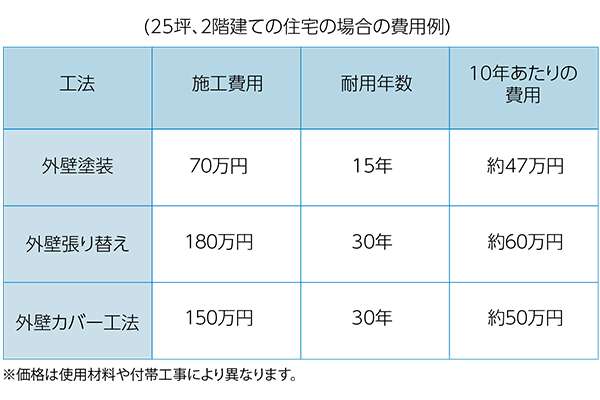 「外壁張り替え」や「外壁カバー工法」も10年に一度は塗装などのメンテナンスが必要です。費用面だけで考えると外壁塗装の方が良さそうですね。
