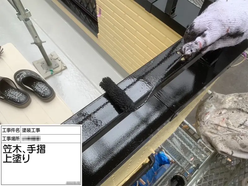 本日は前回に引き続き、笠木・手摺の塗装です。