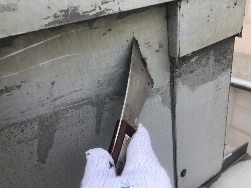 本日はケレン作業を行いました。ケレンとはスクレーパーや皮すき、サンドペーパーなどの道具を使って下地を研磨する作業です。下地を研磨することで付着する汚れや古くなった塗膜を取り除き、塗装が付着しやすい下地に調整できます。経年劣化した下地は表面が凹凸になっていますので、ケレンで平滑にすることも目的の一つです。