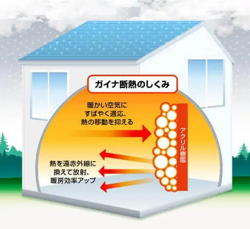 ガイナは建物外部へ塗布すれば暑さ対策に、建物内部に塗布すると寒さ対策になります。